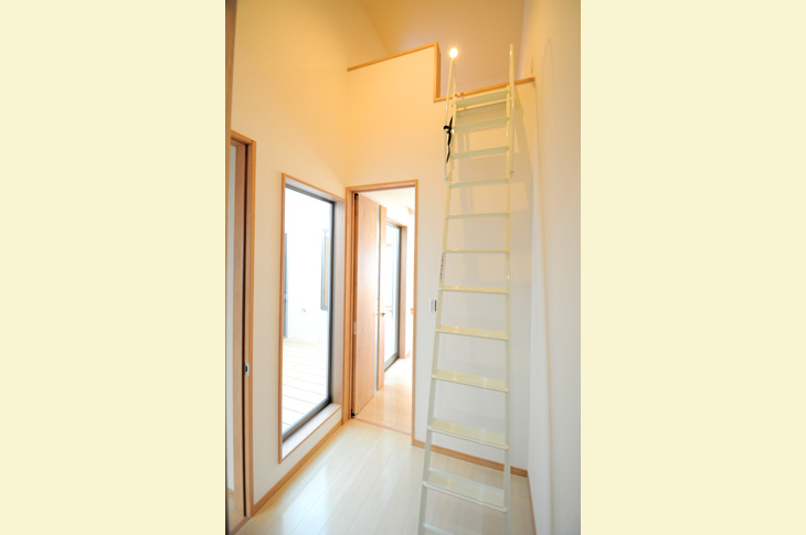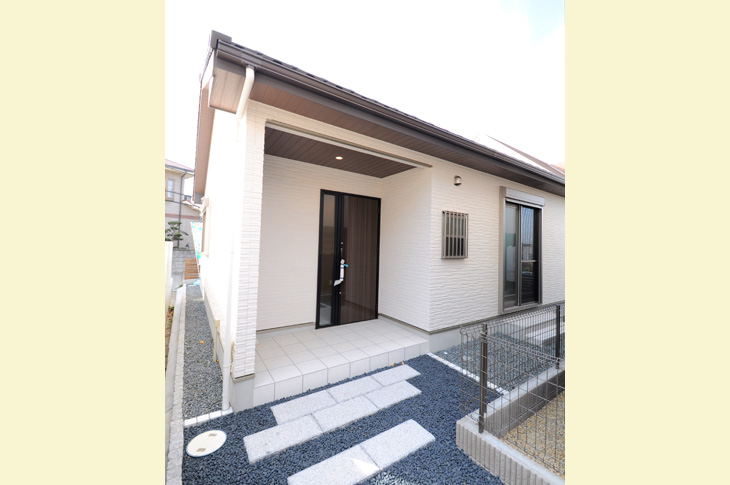 まず目を引くのは約82坪の敷地面積の広さ。3台分の駐車スペースの奥に続くアプローチをすすむと、重厚かつシンプルなデザインの玄関が出迎えてくれます。建物中央にはパティオがあり、外からだけではなく、内側からも陽の光が届くよう設計されており、LDKは鮮やかなブランがメリハリの利いた、明るく広々としたホワイト基調でまとめられています。主寝室は、平屋とは思えないほどの天井高で、大きなロフトスペースも設けています。ロフトは高身長の大人が立ち上がって手も伸ばせるほどゆったりしており、収納だけではなく、趣味の部屋などにも大いに活用できます。フロアや天井にいたる細部に渡り力を注いだ1邸です。